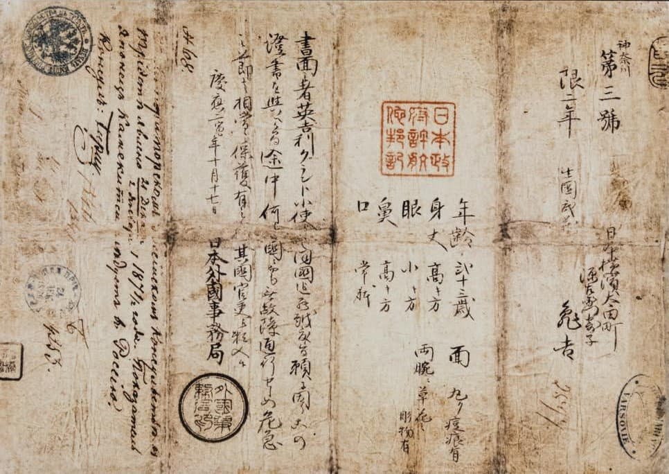 日本人と外国人の交流は、1639年から215年間の鎖国で断絶していた。1854年の「日米和親条約」で日本が開国すると、外国人に接したことで、日本人にも国民意識が芽生えた。1866年に江戸幕府は海外渡航を解禁すると、渡航者が日本人であるという身元証明と海外での保護を求める文書を同年11月23日に発給した。これが実質的な日本初の旅券であり、最初の取得者は曲芸団「日本帝国一座」を率いる隅田川浪五郎。渡航目的は翌年のパリ万国博覧会に出演することだった。