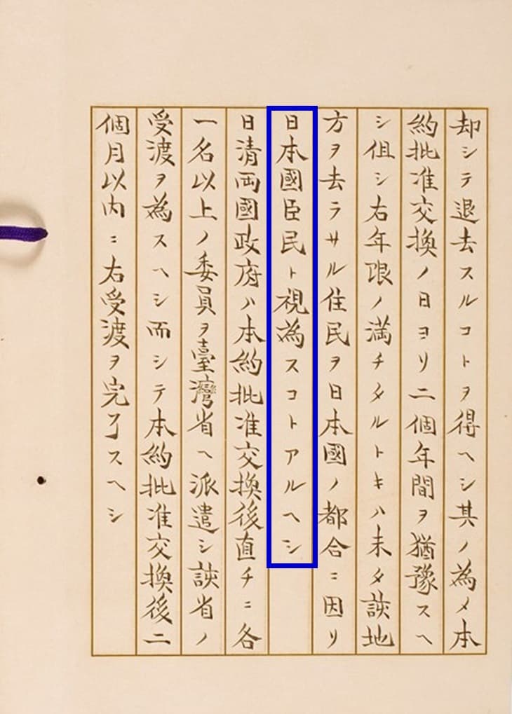 「日本国臣民ト視為スコトアルヘシ」(青色の枠)