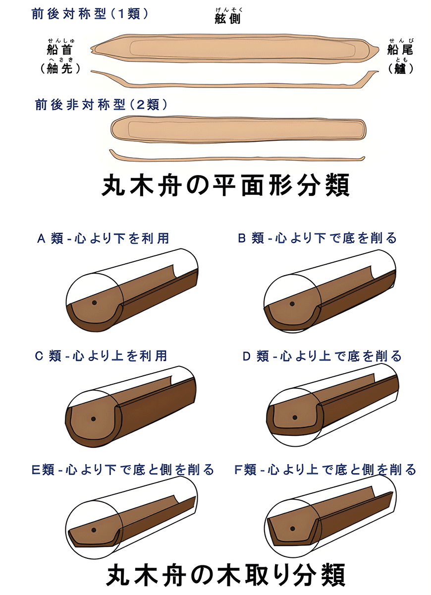 新潟県埋蔵センターの解説によれば、日本国内で縄文時代の丸木舟は99遺跡、173腹が確認できている。最古のものは千葉県富下遺跡の縄文時代草期後半(約7,500年前)のものとされる。丸木舟を作るのに、丸太をどのように切り取り細工するかの「木取り」は、以下のA〜Fの6種類に分類されている。