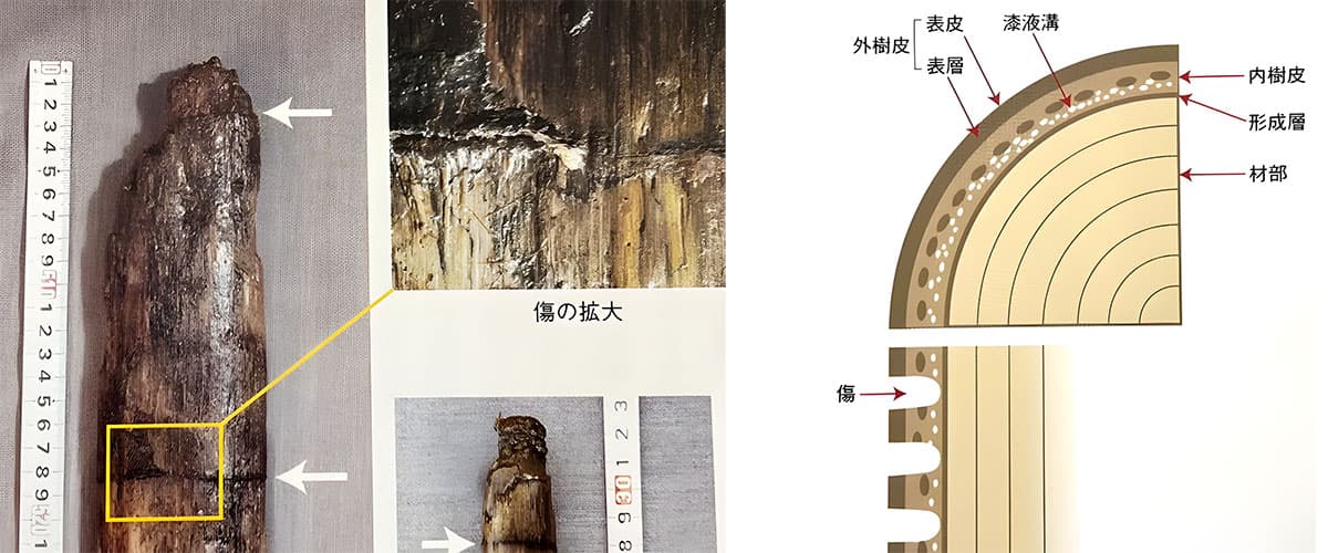 ウルシの種子は自然状態ではほとんど発芽しないので、秋に採取したウルシの種実を冬の間水漬け状態にして、苗を作りウルシ畑として手間暇をかけて成育させる必要がある。成育した木は間伐によって整備され、ウルシ掻きをして樹液を採取する。採取するといっても簡単ではない。ウルシの樹液が流れている管を「樹液溝」といい、その部に達する傷をつけて樹液を採取するのだが、深く削っててしまうと樹木の形成層まで達して木が弱り樹液の出が悪くなる。下の図のような材部に達するか達しないかのギリギリの手加減が必要になるのだ。現代の漆職人はこれを科学的に知って熟練の技を発揮するが、縄文人はどうやってその技術を習得したのだろうか。